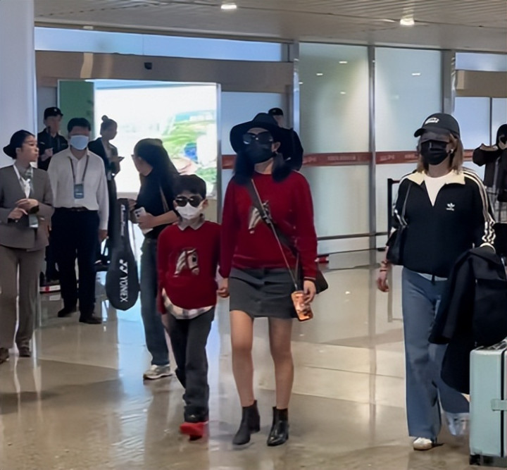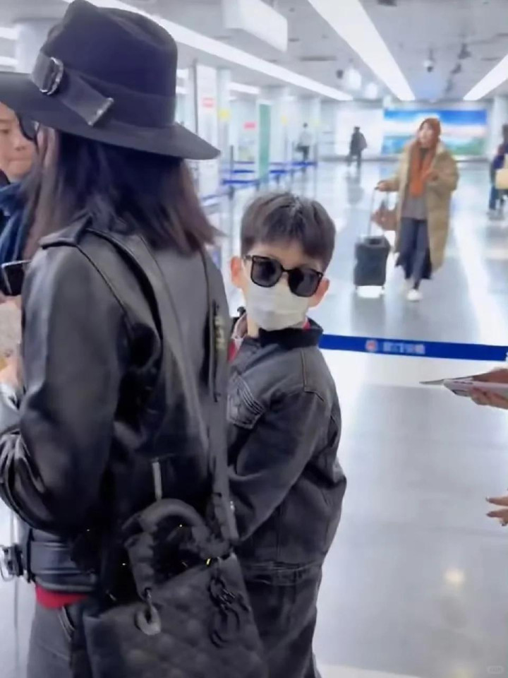 机场里,母子俩穿着黑色亲子装,虽然都戴着口罩,但星星清秀的颜值还是藏不住。