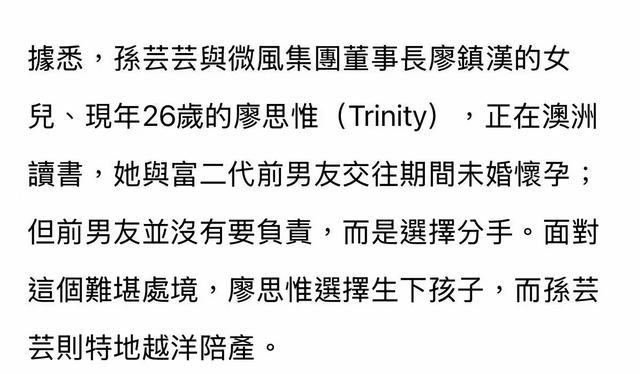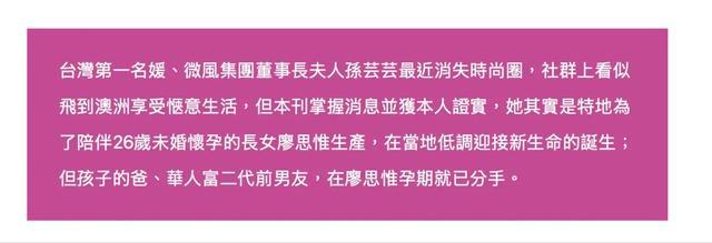直到这个消息曝出,网友才意识到台湾第一名媛、卫生集团董事长夫人孙芸芸最近消失时尚圈,看似在澳洲享受生活,实则是陪伴26岁的未婚怀孕的长女廖思维生产。